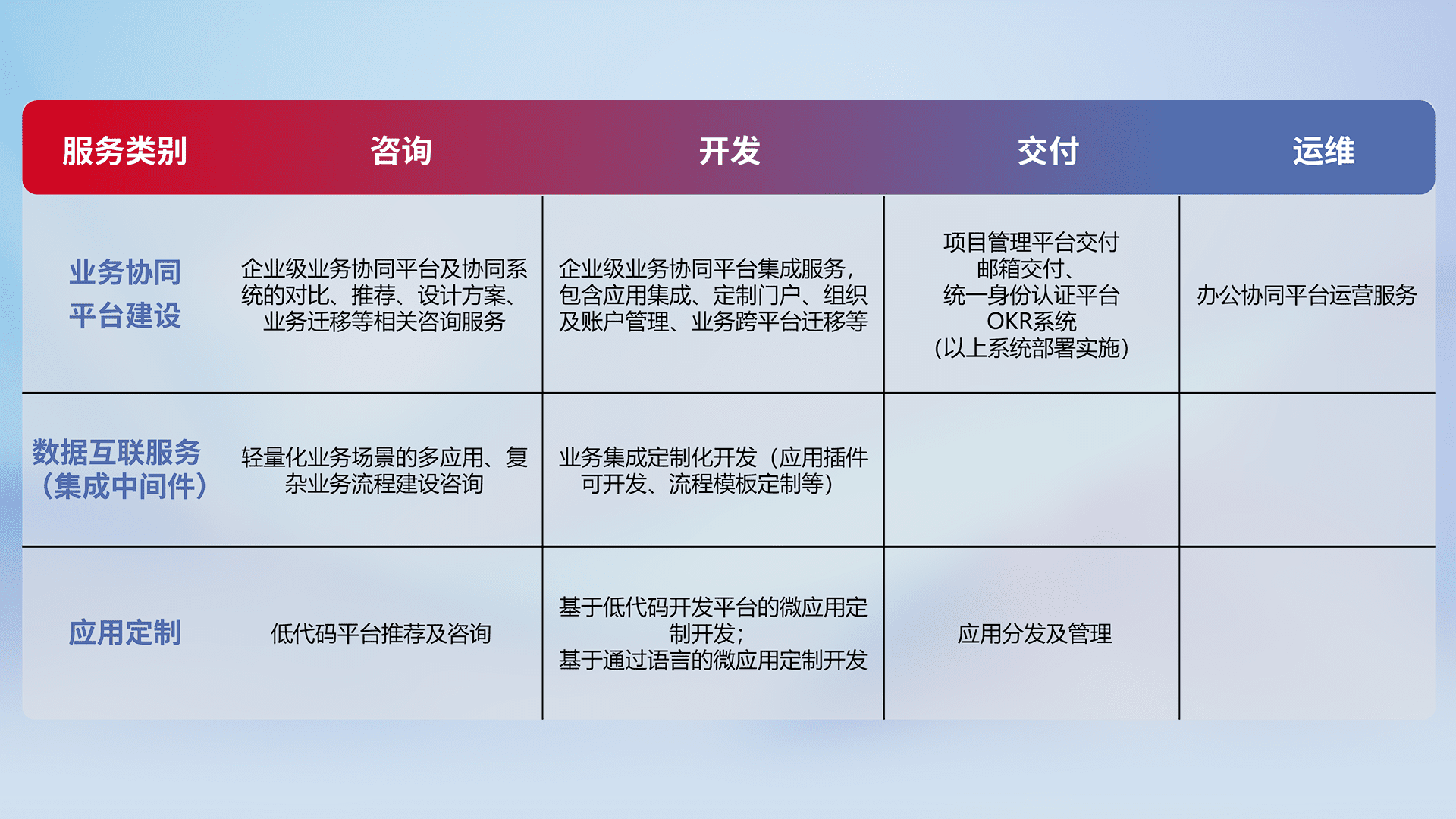 针对钉钉、、、企微、、IDaas等平台级产品提供产品的规划、、方案、、、、交付、、、定制化开发等服务,,实现如统一协同办公、、智能客户服务、、、混合会议管理、、、智能数据查询、、、、等业务场景,,实现数字化转型。。