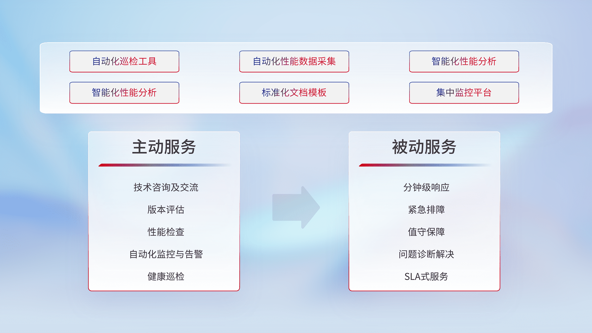 智能化工具和标准化文档,,,保障服务质量,,提供主动服务(包含技术咨询、、、、版本评估、、、、性能检查、、、自动化监控与告警、、、健康巡检)和被动服务包含(分钟级响应、、、紧急排障、、值守保障、、、问题诊断解决、、、、SLA服务)。。